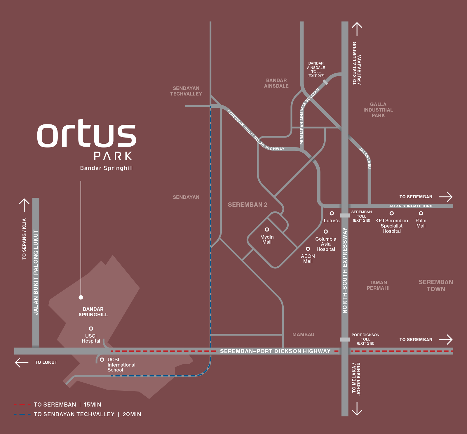 Strategically situated in the central core between Port Dickson and Seremban, Ortus Park is the industrial component of Ortus in Bandar Springhill, a 2,000-acre township conceptualised and developed by West Synergy Sdn Bhd, a subsidiary of MUI Properties Berhad. Surrounded by a variety of modern amenities, this modern industrial park is also located only 14KM from Port Dickson town and 16.5KM from Seremban 2 via the North-South Highway, Seremban-Port Dickson Highway, and the Seremban-Port Dickson trunk road.
